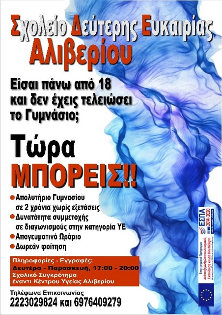 Το Σχολείο Δεύτερης Ευκαιρίας (ΣΔΕ) Αλιβερίου ανακοινώνει ότι ξεκίνησαν οι εγγραφές για τη νέα σχολική χρονιά.