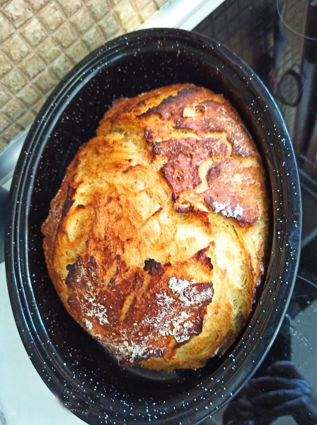 Την ακουμπάμε σε ελαφρά λαδωμένη μικρή γάστρα. Σκεπάζουμε με το καπάκι τη γάστρα. Τη βάζουμε στο φούρνο στην τελευταία κάτω σχάρα, στις αντιστάσεις, στους 50 βαθμούς C, και την αφήνουμε για 1 ώρα ακριβώς. Δυναμώνουμε το φούρνο στους 250º C στις αντιστάσεις και συνεχίζουμε το ψήσιμο για ακόμα 50 λεπτά. Στο τελευταίο δεκάλεπτο του ψησίματος μπορείτε να βγάλετε το καπάκι ή ακόμα και να βγάλετε το ψωμί στη σχάρα του φούρνου ώστε να ροδίσει και να τραγανίσει η κόρα του ολόγυρα.Όταν ροδοκοκκινίσει και φουσκώσει, βγάζουμε το ψωμί από τη γάστρα πάνω σε σχάρα ή σε καθαρή πετσέτα, για να μη νοτίσει.