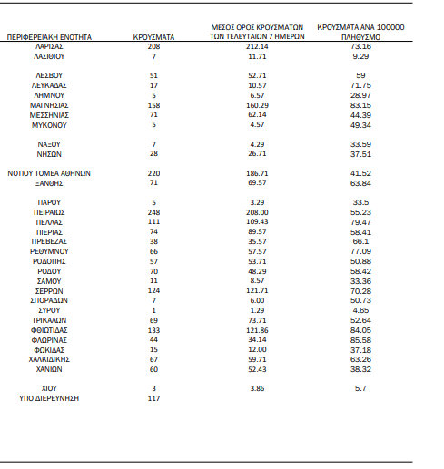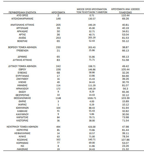 Στους πίνακες κάτω μπορείτε να δείτε τον ημερήσιο αριθμό και τα κρούσματα ανά 100.000 πληθυσμού επιβεβαιωμένων εγχώριων κρουσμάτων COVID-19 ανά περιφερειακή ενότητα σήμερα 25 Νοεμβρίου 2021: