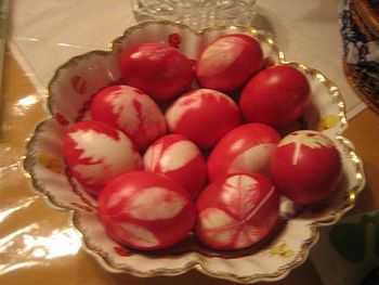 Εκτέλεση: Πάρτε πολύχρωμες κόλλες γλασέ και κόψτε με το εργαλείο που ανοίγουμε τρύπες στα χαρτιά μικρά κυκλάκια. Κολλήστε τα κυκλάκια αραιά πάνω σε βρασμένα αυγά χρησιμοποιώντας ένα πινελάκι με κόλλα, με τρόπο ώστε να φαίνονται πουά. Αν θέλετε μπορείτε να τα έχετε βάψει προηγουμένως κόκκινα. Εναλλακτικά κόψτε τις κόλλες σε καρδούλες ή άλλα σχήματα που σας αρέσουν.