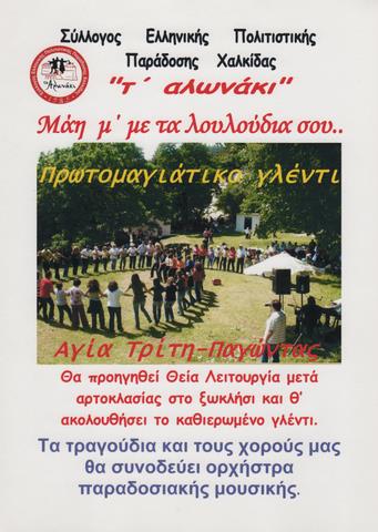 Παραδοσιακό υπαίθριο γλέντι, με τους ήχους παραδοσιακής μουσικής, διοργανώνει την Πρωτομαγιά ( Κυριακή του Θωμά) ο Σύλλογός «τ΄ αλωνάκι», για πέμπτη συνεχή χρονιά, στην Αγία Τρίτη (μετά τον Παγώντα στο δρόμο προς το Προκόπι Ευβοίας).