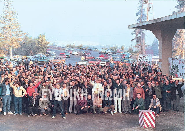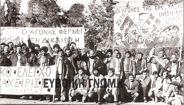 H απεργία στις 29 Νοέμβρη του 1983 (φωτό πάνω) ήταν η πρώτη μετά από τρεις 10ετίες στο Τσιμεντάδικο. Πρόεδρος ήταν ο Αντώνης Αλεξάνδρου που είχε διαδεχθεί το συντηρητικό Βαγγέλη Κατσούλη.