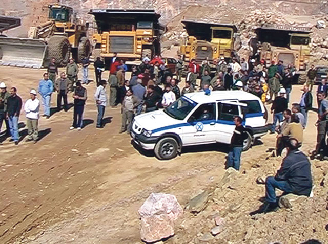 ΜΑΡΤΙΟΣ 2007: Με μηχανήματα και με τα σώματά τους οι εργαζόμενοι εμποδίζουν τον εργολάβο να μπει στο λατομείο. Η Αστυνομία προσπαθεί να αποτρέψει τα επεισόδια.