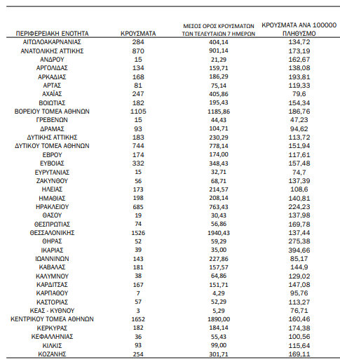 Στους πίνακες παρακάτω μπορείτε να δείτε ποιος είναι ο ημερήσιος αριθμός και τα κρούσματα ανά 100.000 πληθυσμού επιβεβαιωμένων εγχώριων κρουσμάτων COVID-19 ανά περιφερειακή ενότητα στις 26 Μαρτίου 2022: