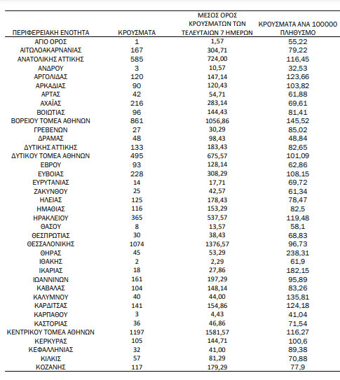 Στους πίνακες κάτω μπορείτε να δείτε ποιος είναι ο ημερήσιος αριθμός και τα κρούσματα ανά 100.000 πληθυσμού επιβεβαιωμένων εγχώριων κρουσμάτων COVID-19 ανά περιφερειακή ενότητα στις 07 Απριλίου 2022: