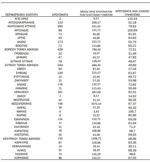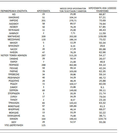 Στους πίνακες κάτω μπορείτε να δείτε ποιος είναι ο ημερήσιος αριθμός και τα κρούσματα ανά 100.000 πληθυσμού επιβεβαιωμένων εγχώριων κρουσμάτων COVID-19 ανά περιφερειακή ενότητα στις 11 Απριλίου 2022: