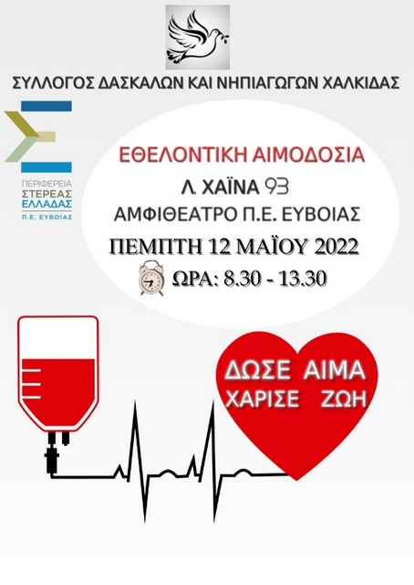Ο Σύλλογος Δασκάλων - Νηπιαγωγών Χαλκίδας σε συνεργασία με την Περιφερειακή Ενότητα Εύβοιας, πραγματοποιεί εθελοντική αιμοδοσία προκειμένου να ενισχυθεί η τράπεζα αίματος του Συλλόγου.