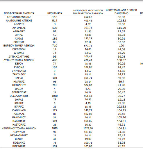 Στους πίνακες κάτω μπορείτε να δείτε ποιος είναι ο ημερήσιος αριθμός και τα κρούσματα ανά 100.000 πληθυσμού επιβεβαιωμένων εγχώριων κρουσμάτων COVID-19 ανά περιφερειακή ενότητα στις 14 Απριλίου 2022: