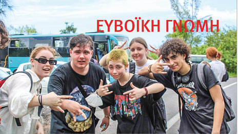 Η Ασημένια Φραγκογιαννακάκη, ο Κώστας Γκίκας και ο Αλέξανδρος Κυριακλείδης (δεξιά) παρέα με αλλοδαπούς συνομήλικούς τους.
