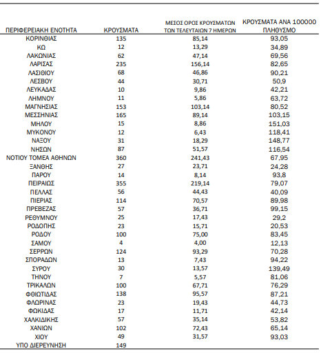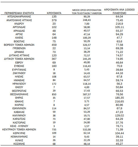 Στους πίνακες κάτω μπορείτε να δείτε ποιος είναι ο ημερήσιος αριθμός και τα κρούσματα ανά 100.000 πληθυσμού επιβεβαιωμένων εγχώριων κρουσμάτων COVID-19 ανά περιφερειακή ενότητα στις 28 Απριλίου 2022: