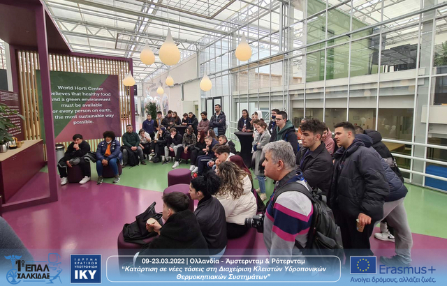 Σύμφωνα με το πρόγραμμα κινητικότητας με τίτλο «Κατάρτιση σε νέες τάσεις στη διαχείριση κλειστών υδροπονικών θερμοκηπιακών συστημάτων», οι μαθητές/τριες επισκέφθηκαν το World Horti Center που ορίζεται ως «το παγκόσμιο κέντρο γνώσης και καινοτομίας στις καλλιέργειες οπωροκηπευτικών στο θερμοκήπιο», εξοικειώθηκαν με σύγχρονες μεθόδους καλλιέργειας και ενημερώθηκαν σε θέματα όπως: