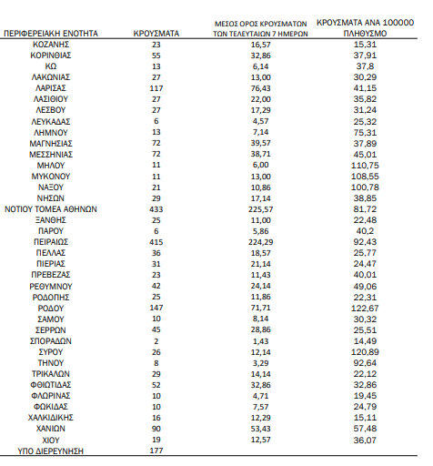 Στους πίνακες κάτω μπορείτε να δείτε ποιος ο ημερήσιος αριθμός και τα κρούσματα ανά 100.000 πληθυσμού επιβεβαιωμένων εγχώριων κρουσμάτων COVID-19 ανά περιφερειακή ενότητα στις 24 Μαΐου 2022: