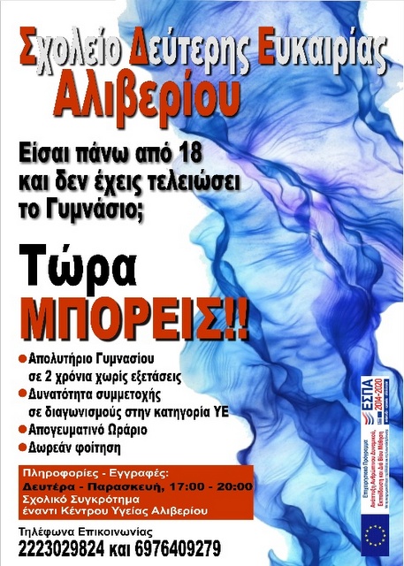 Το Σχολείο Δεύτερης Ευκαιρίας (ΣΔΕ) Αλιβερίου ανακοινώνει ότι ξεκίνησαν οι προεγγραφές για τη νέα σχολική χρονιά.
