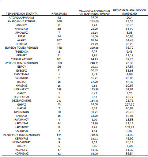 Στους πίνακες κάτω μπορείτε να δείτε ποιος είναι ο ημερήσιος αριθμός και τα κρούσματα ανά 100.000 πληθυσμού επιβεβαιωμένων εγχώριων κρουσμάτων COVID-19 ανά περιφερειακή ενότητα την Πέμπτη 9 Ιουνίου 2022: