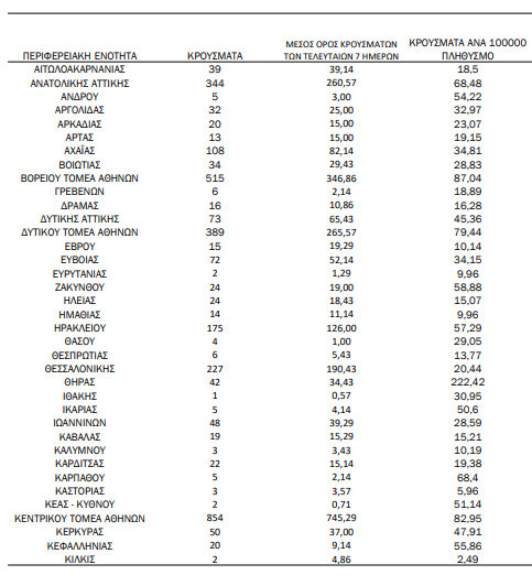 Στους πίνακες κάτω μπορείτε να δείτε ποιος είναι ο ημερήσιος αριθμός και τα κρούσματα ανά 100.000 πληθυσμού επιβεβαιωμένων εγχώριων κρουσμάτων COVID-19 ανά περιφερειακή ενότητα την Παρασκευή 10 Ιουνίου 2022: