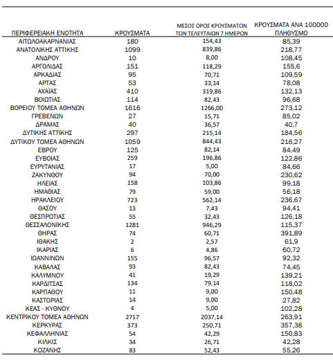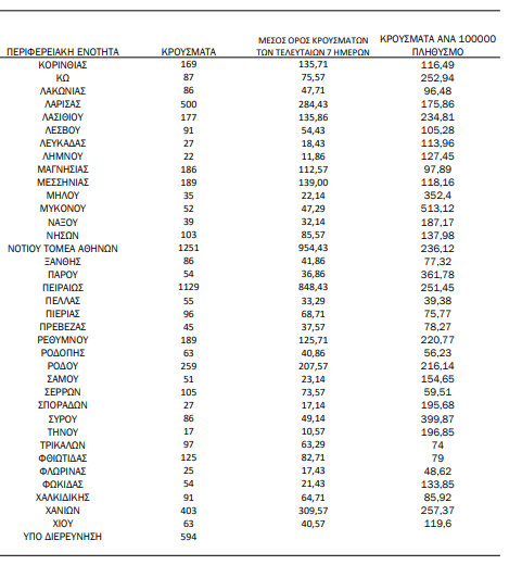 Δείτε στους πίνακες κάτω ποιος είναι ο ημερήσιος αριθμός και τα κρούσματα ανά 100.000 πληθυσμού επιβεβαιωμένων εγχώριων κρουσμάτων COVID-19 ανά περιφερειακή ενότητα την Πέμπτη 30 Ιουνίου 2022: