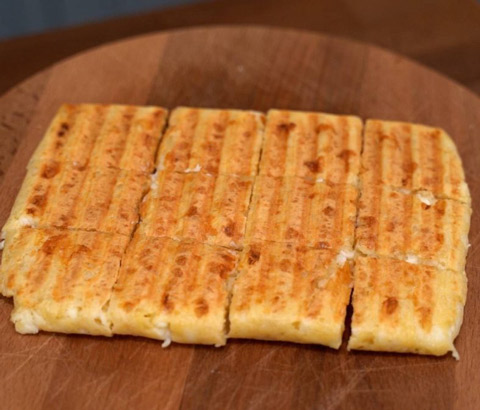 Την τοποθετούμε πάνω σε αντικολλητικό χαρτί και διπλώνουμε όλες τις άκρες, ώστε να καλυφθεί από κάθε πλευρά. Ψήνουμε σε προθερμασμένη τοστιέρα για περίπου 15 λεπτά με το αντικολλητικό χαρτί και για άλλα 5 λεπτά χωρίς.
