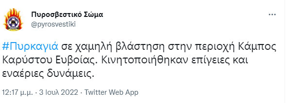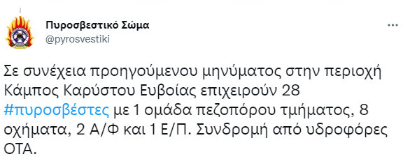 Το αρχικό μήνυμα στο twitter από την Πυροσβεστική ανέφερε:
