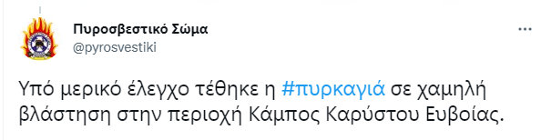 Υπό μερικό έλεγχο τέθηκε η πυρκαγιά στην Κάρυστο, που σήμανε συναγερμό στην Πυροσβεστική Υπηρεσία και ζωντάνεψε τον εφιάλτη του περσινού καλοκαιριού, για την Εύβοια (δείτε εδώ την αρχική είδηση).