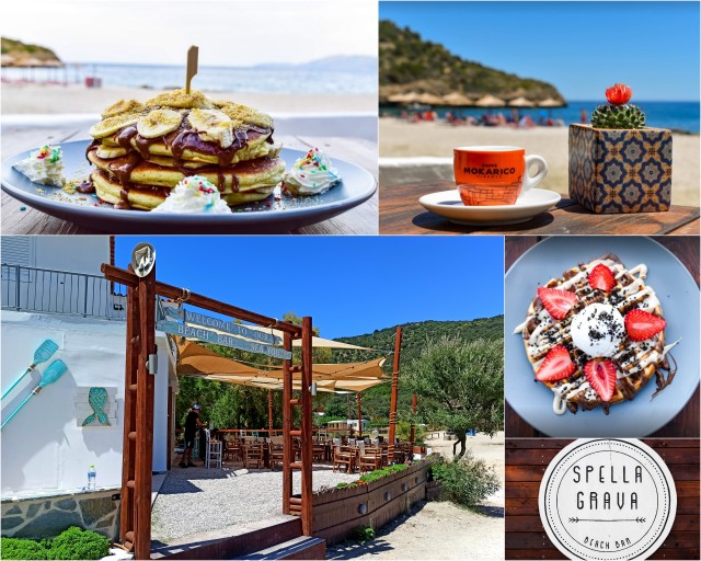 Στο πανέμορφο Spella Grava στην άκρη της παραλίας θα βρεις ξαπλώστρες στη θάλασσα, αλλά και τραπεζάκια, αν θες να κάτσεις υπό σκιά.
