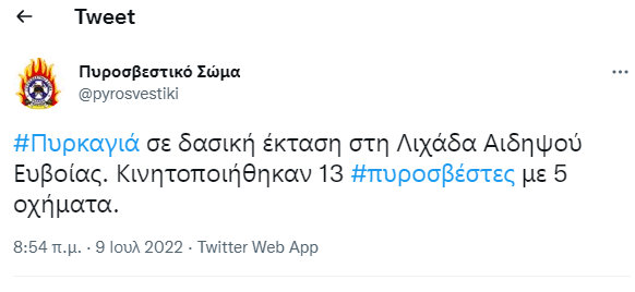 Από άγνωστη αιτία εκδηλώθηκε φωτιά, στην περιοχή της Λιχάδας, του Δήμου Ιστιαίας-Αιδηψού, το πρωί του Σαββάτου 9 Ιουλίου. Άμεση ήταν η κινητοποίηση της Πυροσβεστικής Υπηρεσίας, στην οποία σήμανε συναγερμός.