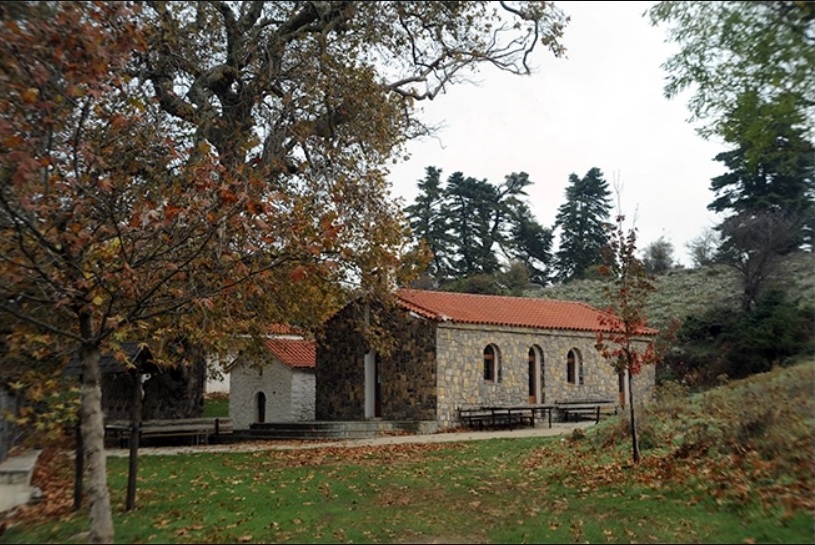 Στον περίβολο του ναού, κάτω από τα πλατάνια, υπάρχει ειδικά διαμορφωμένος χώρος με ξύλινα μοναστηριακά τραπέζια και παγκάκια καθώς και μια αστείρευτη πηγή που τρέχει ακόμη και το καλοκαίρι παγωμένο νερό.