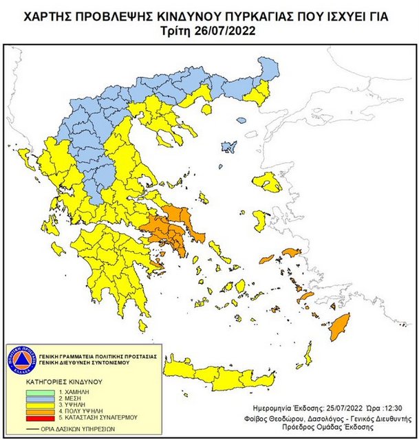 Πολύ υψηλός κίνδυνος πυρκαγιάς (κατηγορία κινδύνου 4) προβλέπεται αύριο, Τρίτη 26 Ιουλίου, για τέσσερις περιφέρειες της χώρας, σύμφωνα με τον Χάρτη Πρόβλεψης Κινδύνου Πυρκαγιάς, που εκδίδει η Γενική Γραμματεία Πολιτικής Προστασίας.