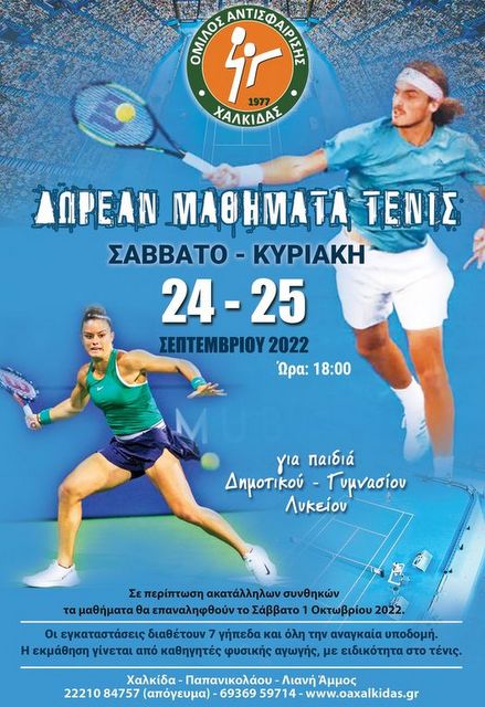 Δωρεάν μαθήματα τένις σε παιδιά, ηλικίας από 6 μέχρι 18 ετών, θα πραγματοποιηθούν, το Σαββατοκύριακο 24-25 Σεπτεμβρίου, στις εγκαταστάσεις του Ομίλου Αντισφαίρισης Χαλκίδας, ο οποίος εξέδωσε την ακόλουθη ανακοίνωση: