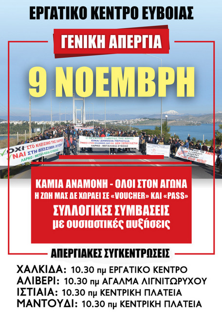 Ημέρα Γενικής Πανελλαδικής Απεργίας είναι η Τετάρτη 9 Νοεμβρίου και το Εργατικό Κέντρο Εύβοιας συμμετέχει στις κινητοποιήσεις και διοργανώνει απεργιακές συγκεντρώσεις σε τέσσερις πόλεις της Εύβοιας, ως εξής: