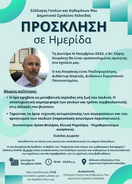 Ο Σύλλογος γονέων και Κηδεμόνων του 9ου Δημοτικού Σχολείου Χαλκίδας διοργανώνει μία εξαιρετικά ενδιαφέρουσα ημερίδα, που απευθύνεται σε όλους τους γονείς, την Δευτέρα 14 Νοεμβρίου, στις 6 το απόγευμα, στο χώρο του σχολείου, με δωρεάν είσοδο για το κοινό.