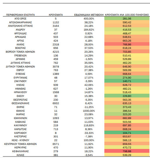 Στους πίνακες κάτω μπορείτε να δείτε τo σύνολο των κρουσμάτων, την επίπτωση ανά 100.000 πληθυσμού καθώς και την εβδομαδιαία μεταβολή των επιβεβαιωμένων κρουσμάτων COVID-19, ανά περιφερειακή ενότητα, την εβδομάδα αναφοράς σε σύγκριση με την προηγούμενη εβδομάδα: