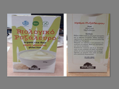 " Ο Ε.Φ.Ε.Τ. και ειδικότερα η Περιφερειακή Διεύθυνση Αττικής του Ε.Φ.Ε.Τ., κατά τη διενέργεια επιθεώρησης στο πλαίσιο διερεύνησης αναφοράς καταναλωτή, προέβη σε έλεγχο του τροφίμου «Evergreen organics Βιολογικό ρυζάλευρο χωρίς γλουτένη» των 500g με στοιχεία: «L245045220720 και ημερομηνία ανάλωσης 23-05-23, το προϊόν συσκευάζεται στην Ελλάδα για την Αγροτική Βιολογική Εμπορική Α.Ε.».