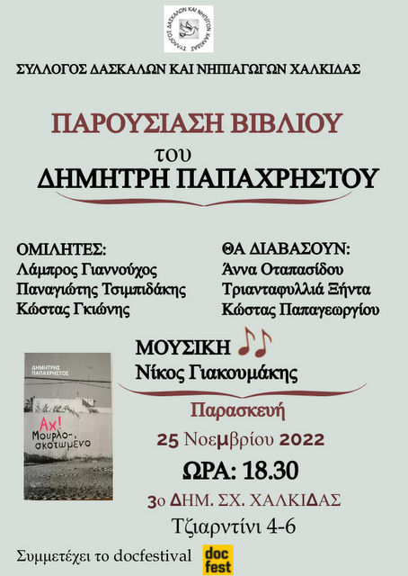 Στο πλαίσιο του εορτασμού του Πολυτεχνείου και της Εθνικής Αντίστασης το Δ.Σ. του Συλλόγου Δασκάλων και Νηπιαγωγών Χαλκίδας διοργανώνει εκδήλωση για την παρουσίαση του νέου βιβλίου του εκφωνητή του Πολυτεχνείου Δημήτρη Παπαχρήστου, με τίτλο «Αχ ! Μουρλοσκοτωμένο».