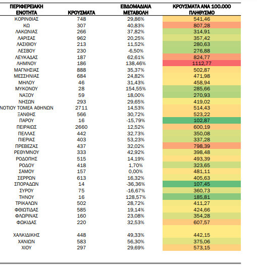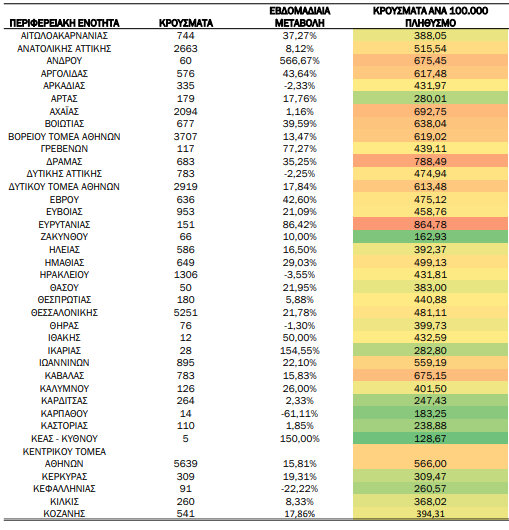 Δείτε αναλυτικά στους πίνακες που ακολουθούν τo σύνολο των κρουσμάτων, την επίπτωση ανά 100.000 πληθυσμού καθώς και την εβδομαδιαία μεταβολή των επιβεβαιωμένων κρουσμάτων COVID-19 ανά περιφερειακή ενότητα την εβδομάδα αναφοράς σε σύγκριση με την προηγούμενη εβδομάδα.