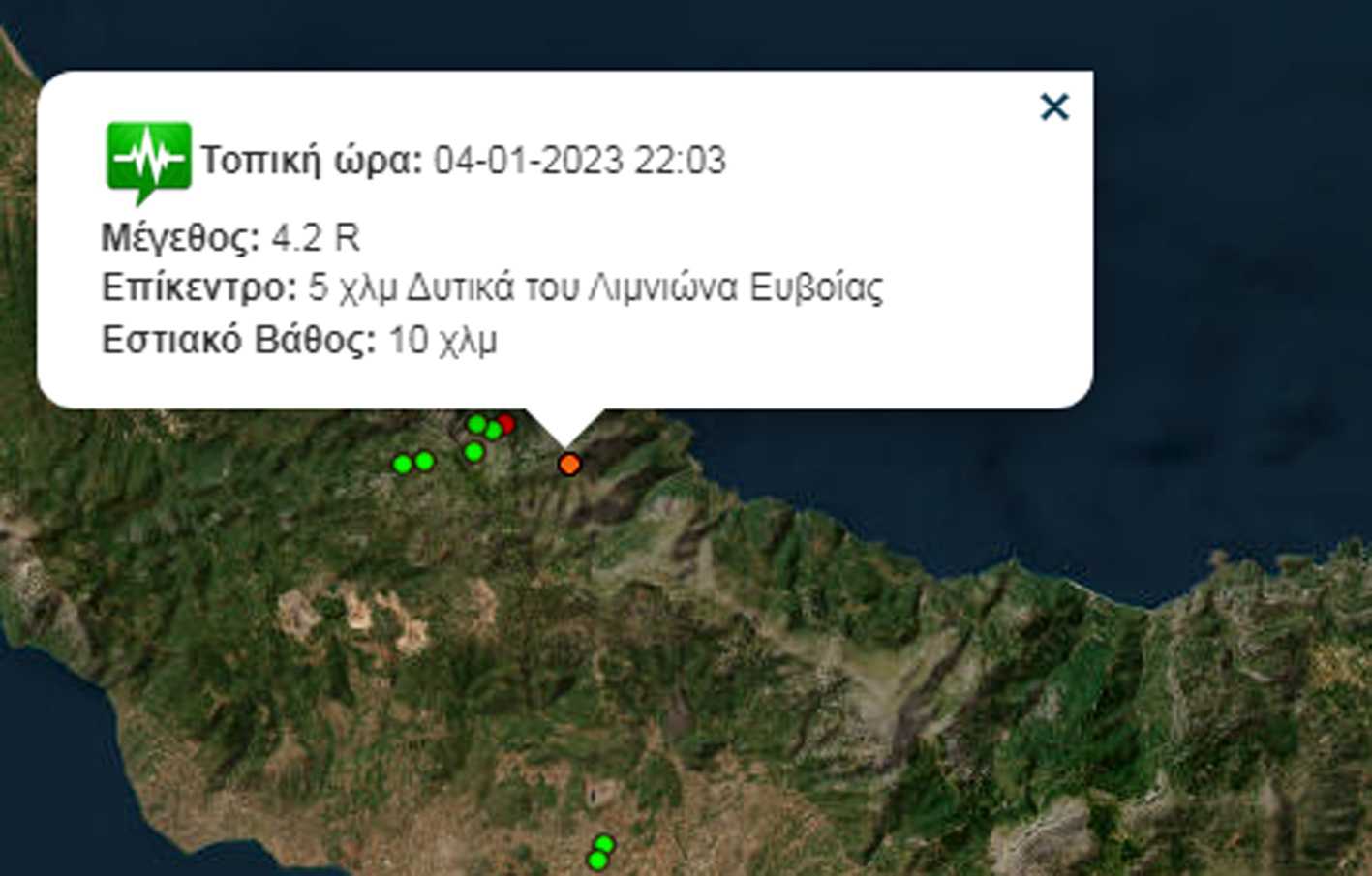 Σεισμική δόνηση εντάσεως 4,2 βαθμών της κλίμακας Ρίχτερ σημειώθηκε στις 10:03 το βράδυ της Τετάρτης 4 Ιανουαρίου στην ευρύτερη περιοχή του Δήμου Διρφύων - Μεσσαπίων.
