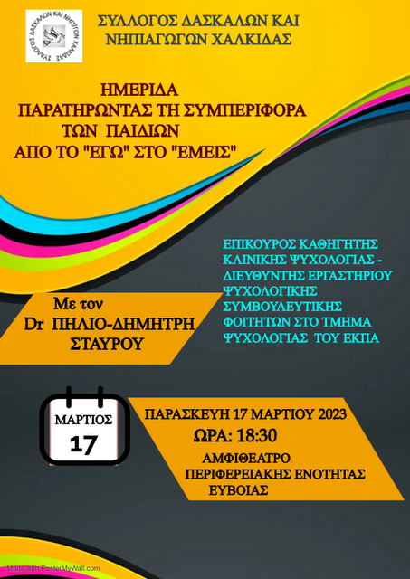 Ο Σύλλογος Δασκάλων και Νηπιαγωγών Εύβοιας, την Παρασκευή 17 Μαρτίου, στις 6:30 το απόγευμα, στο αμφιθέατρο της Περιφερειακής Ενότητας Εύβοιας διοργανώνει ημερίδα, με θέμα " Παρατηρώντας την συμπεριφορά των παιδιών. Από το εγώ στο εμείς".