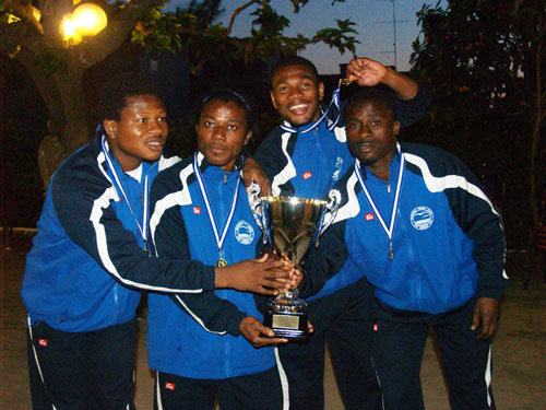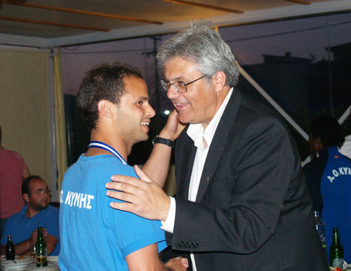Τους παίχτες της ομάδας ασπάστηκε έναν-έναν ο πρόεδρος του ΑΟ Κύμης παναγιώτης Θωμάς (στη φωτό πάνω με τον Αποστολίδη), ενώ χαρούμενοι πόζαραν με το κύπελλο αγκαλιά όλοι οι πρωταθλητές και κυρίως οι τέσσερις έγχρωμοι Τζον, Μπόε, Οστιν και Φαβιέ (φωτό κάτω), οι οποίοι τη νέα περίοδο δεν θα μπορούν να αγωνίζονται στην ομάδα.