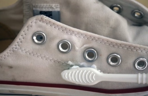 Οδοντόκρεμα: Μια επίσης καλή λύση είναι να βάλετε οδοντόκρεμα σε μια παλιά οδοντόβουρτσα και να τρίψετε καλά τα παπούτσια σας. Η οδοντόκρεμα βοηθάει πολύ στον καθαρισμό των δύσκολων λεκέδων και δεν πρόκειται να βλάψει το παπούτσι σας.