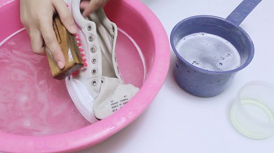 Σαπούνι και νερό: Η πιο απλή μέθοδος που αξίζει να δοκιμάσετε είναι να πλύνετε τοπικά τα παπούτσια σας με σαπούνι και νερό. Χρησιμοποιήστε μια παλιά οδοντόβουρτσα για να τρίψετε τους επίμονους λεκέδες. Φροντίστε να έχετε αφαιρέσει τα κορδόνια ώστε να καθαρίσουν τα παπούτσια σας πιο εύκολα. Τα κορδόνια μπορείτε να τα πλύνετε κανονικά στο πλυντήριο ή να τα βάλετε μέσα σε χλωρίνη.