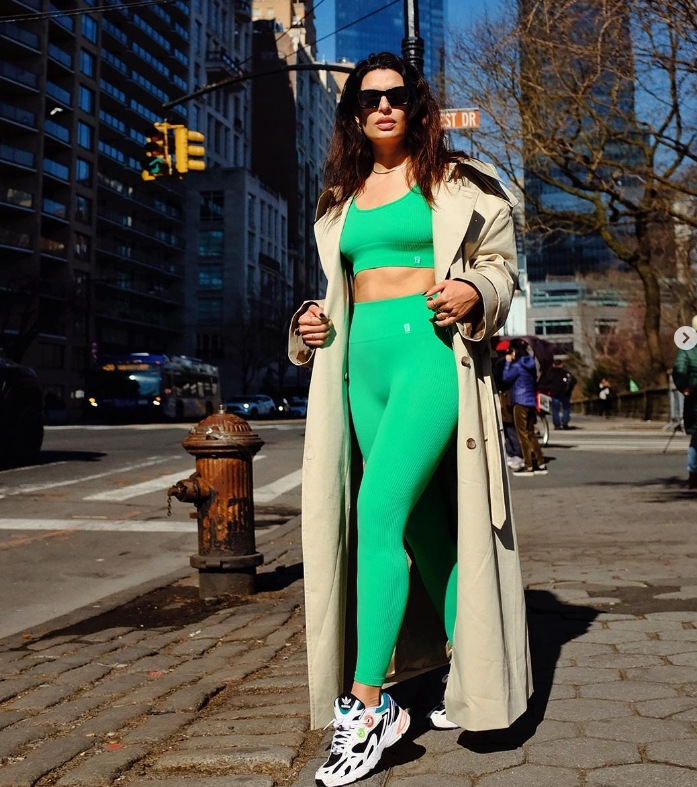 Συγκεκριμένα, αυτή τη φορά φόρεσε ένα καταπράσινο σετ, κολάν και το τοπ του, ένα όμορφο σύνολο για άνετες βόλτες στην πόλη.