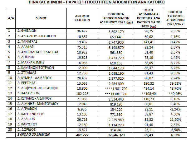 *Για το ποσοστό σύγκρισης των Α’ τριμήνων του 2022 & 2023 του Δήμου Διρφύων – Μεσσαπίων και την ποσότητα ανά κάτοικο για το 2023, χρησιμοποιήθηκε η ποσότητα εισερχομένων στο ΧΥΤΑ Λαμίας και στο ΧΥΤΑ Τρικάλων το Α’ τρίμηνο του 2023.