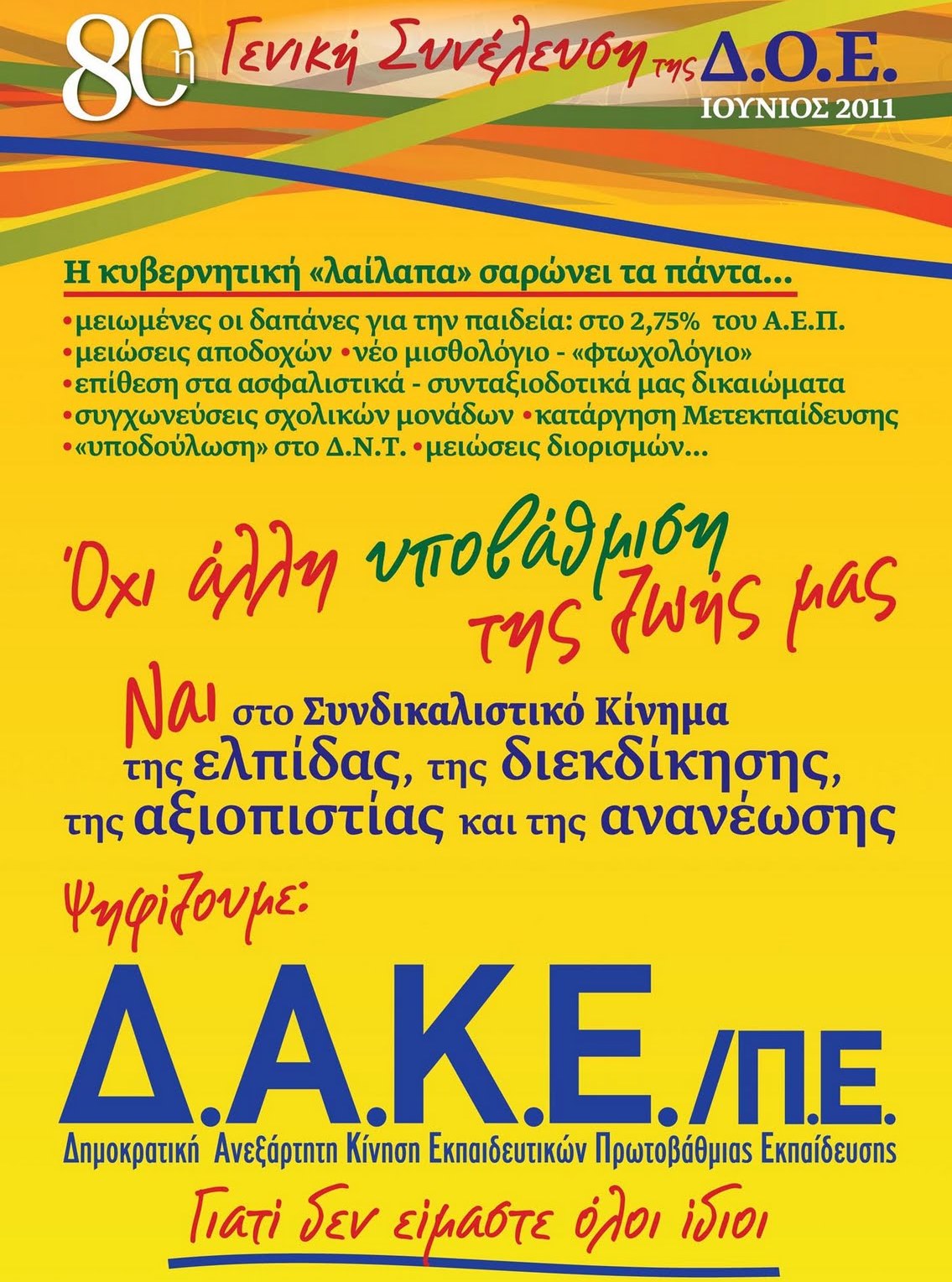 Η ΔΑΚΕ Πρωτοβάθμιας Εκπαίδευσης Χαλκίδας καλεί τους δασκάλους σε πανστρατιά κατά της κυβερνητικής πολιτικής και του Μνημονίου, με αφορμή τις εκλογές για την ανάδειξη εκπροσώπων στην Ομοσπονδία την Τετάρτη 1 Ιουνίου.