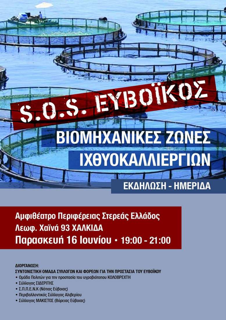 Εκδήλωση -ημερίδα, με τίτλο " SOS Ευβοϊκός - Βιομηχανικές Ζώνες Ιχθυοκαλλιεργειών" διοργανώνει η Συντονιστική Ομάδα Συλλόγων και Φορέων για την προστασία του Ευβοϊκού.
