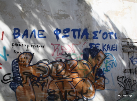 Το σύνθημα στην οδό Γιαννίτση είναι πράγματι σοφό. " Βάλε φωτιά σε ό,τι σε καίει" Μας θύμισε ένα παρόμοιο, που λέει: Μην αφήνεις αυτό που σε τρώει να χορτάσει! Μακάρι να μπορούσαμε να τα κάνουμε πράξη...