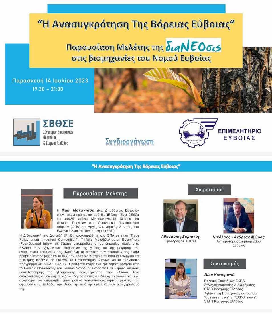 Πρόκειται για την παρουσίαση μελέτης της "διαΝΕΟσις" στις βιομηχανίες του νομού Ευβοίας, η οποία θα πραγματοποιηθεί την Παρασκευή 14 Ιουλίου, από τις 7:30 το απόγευμα μέχρι τις 9 το βράδυ.