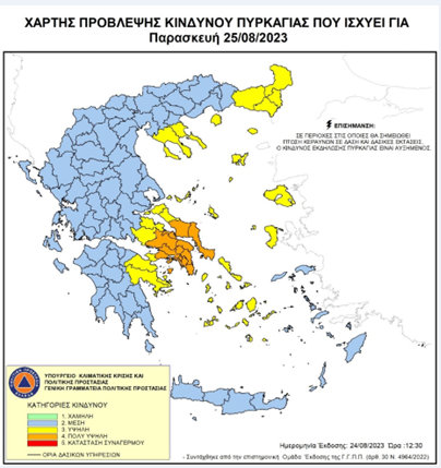 Σύμφωνα με το Χάρτη Πρόβλεψης Κινδύνου Πυρκαγιάς που εκδίδει η Γενική Γραμματεία Πολιτικής Προστασίας, για αύριο Παρασκευή 25 Αυγούστου, προβλέπεται πολύ υψηλός κίνδυνος πυρκαγιάς (κατηγορία κινδύνου 4) στο μεγαλύτερο τμήμα της Εύβοιας (δείτε στο χάρτη κάτω).