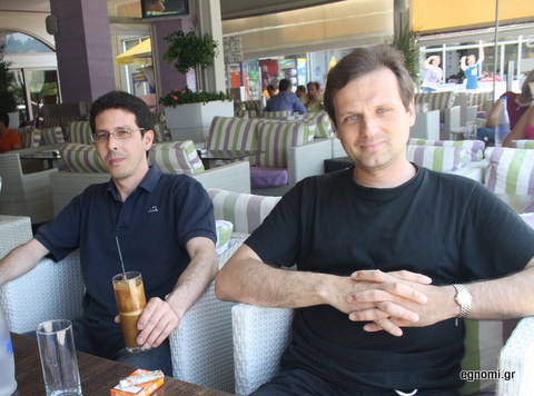Ο Μιχάλης Γρατσάνος και ο φίλος του Παναγιώτης Χατζηγεωργίου εκμεταλλεύτηκαν το ρεπό που είχαν και απόλαυσαν το καφεδάκι τους στην παραλία, συζητώντας επί παντός επιστητού.