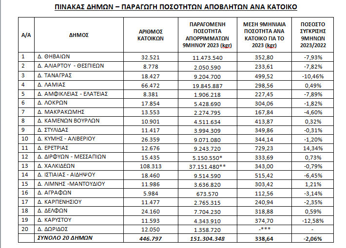 Η παραγωγή αποβλήτων ανά Δήμο και κάτοικο φαίνεται στον παρακάτω πίνακα: