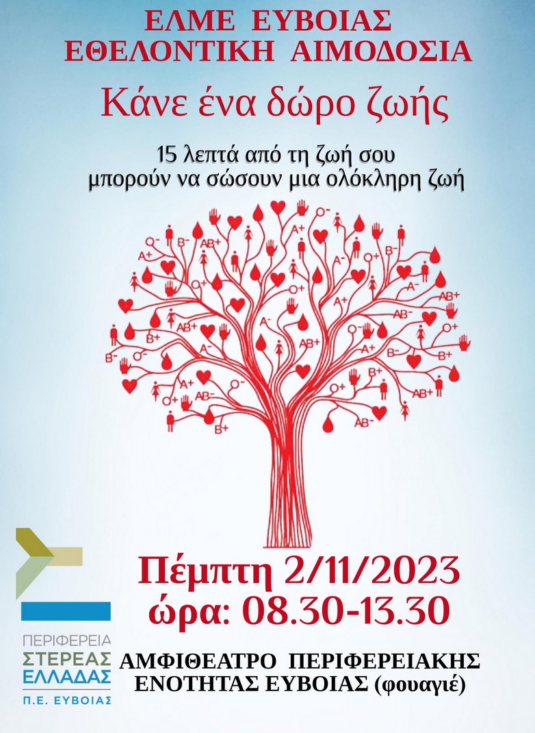 Η Ένωση Λειτουργών Μέσης Εκπαίδευσης (ΕΛΜΕ) Εύβοιας διοργανώνει εθελοντική αιμοδοσία την Πέμπτη 2 Νοεμβρίου, από τις 8:30 το πρωί μέχρι την 1:30 το μεσημέρι.