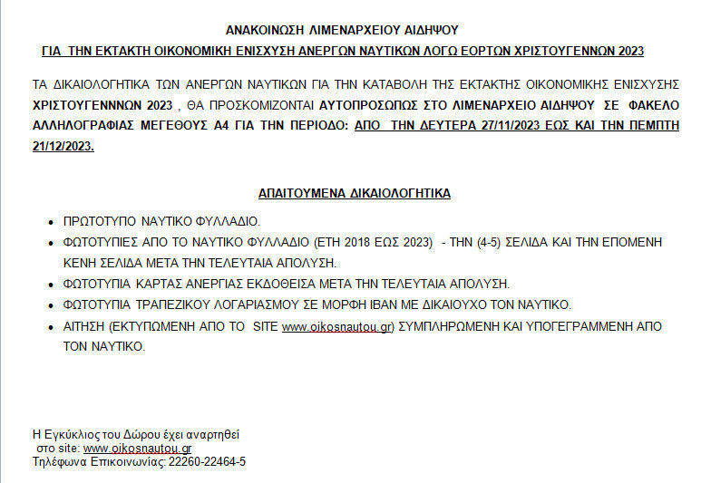 Από το Λιμεναρχείο Αιδηψού προωθήθηκε ανακοίνωση του Οίκου Ναύτου Αιδηψού, σχετικά με την χορήγηση της έκτακτης οικονομικής ενισχύσεως σε ανέργους ναυτικούς, λόγω εορτών Χριστουγέννων έτους 2023.